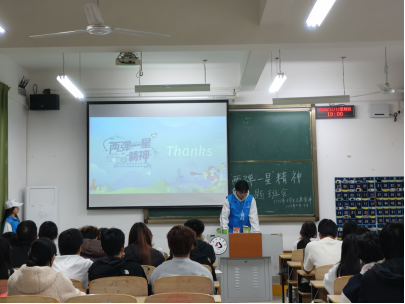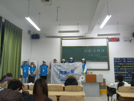 班会上,赤商追光者志愿服务队成员以“历史回眸+精神解读”的方式,生动讲述了邓稼先隐姓埋名二十八载、钱学森突破重重阻挠归国等感人故事。这些鲜活事例将“热爱祖国、无私奉献,自力更生、艰苦奋斗,大力协同、勇于登攀”的“两弹一星”精神生动展现在同学们面前,引发了深刻共鸣。