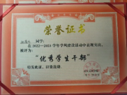 军政淬炼中,他同样表现突出。2023年6月军训期间,所在的三营八连一排先后获评“军训内务卫生先进集体”和“军训歌咏比赛优等奖”,个人获评“军训优秀学员”;两次参与团学干部培训(2023年第十九期、2024年第二十一期)均以优异成绩结业,带领班级获评校级“先进班集体”,个人多次荣获“优秀学生干部”称号,用行动诠释了青年担当。